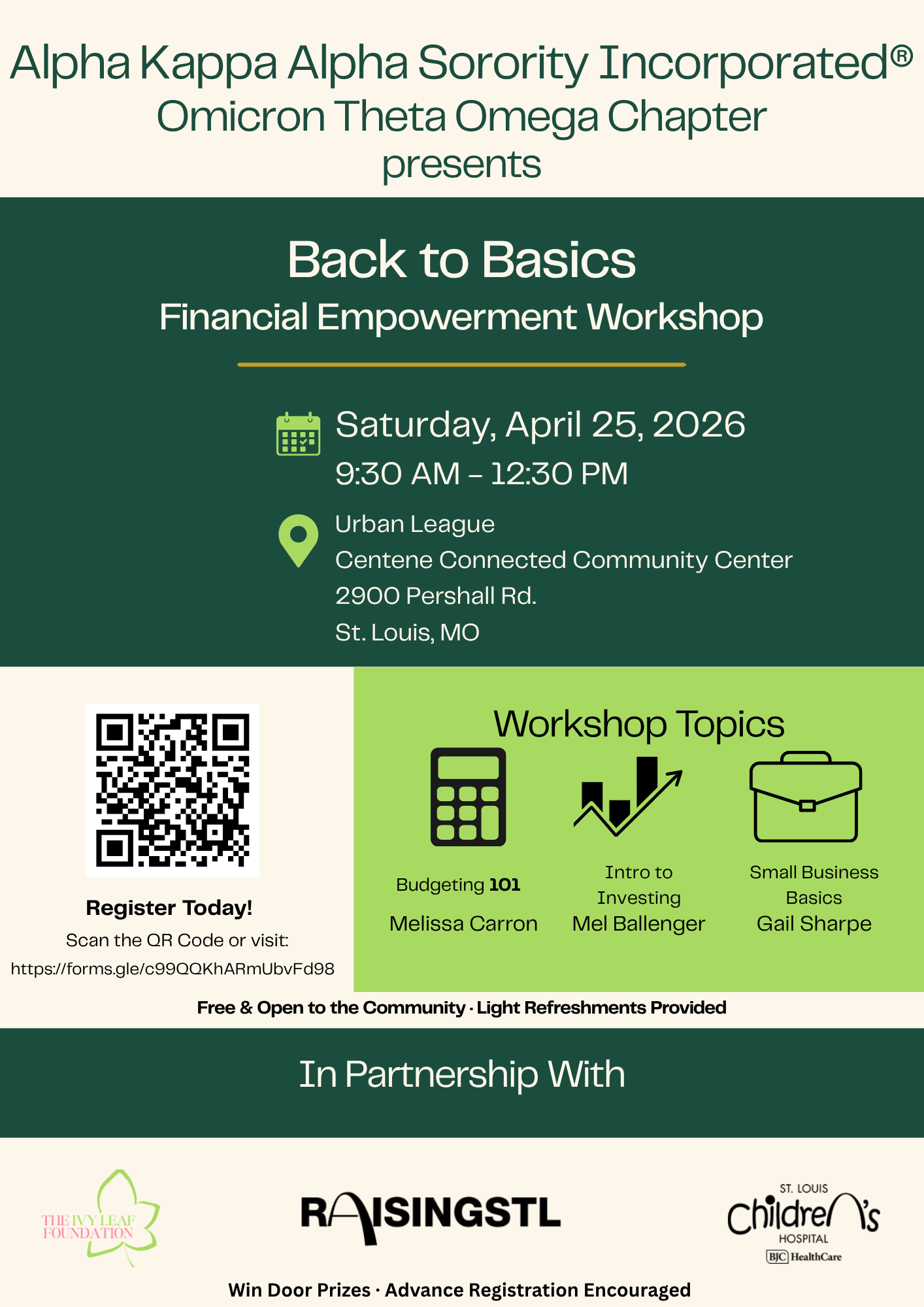 Join the Office of Financial Empowerment, AKA Omicron Theta Omega Chapter, Raising STL and The Ivy Leaf Foundation for a Financial Literacy Day for the Whole Family!  Come be part of a fun and informative community event featuring valuable financial wellness resources, refreshments, and exciting door prizes.  Don’t miss out—scan the QR code or click the link to register today!